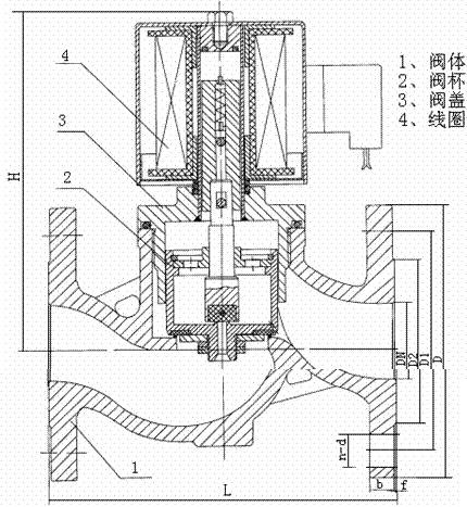 本閥為分步動作直接導(dǎo)式常閉電磁閥,線圈通電后銜鐵先帶動小閥開啟,大閥在所形成的介質(zhì)壓差和電磁力的作用下而開啟。線圈斷電,銜鐵部件復(fù)位,大小閥利用介質(zhì)壓力而緊密關(guān)閉。